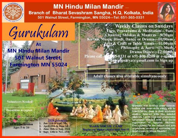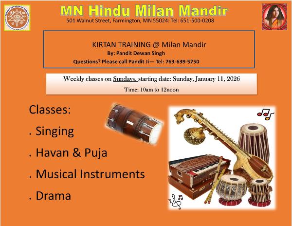 Kirtan Classes are being offered weekly at Milan Mandir commencing Sunday January 11, 2026. Timing: 10am to 12noon