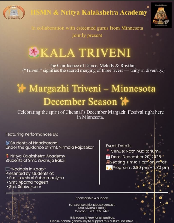 HSMN and Nritya Kalakshetra Academy, in collaboration with esteemed Minnesota gurus, proudly invite you to a soulful celebration inspired by Chennai's iconic Margazhi Festival -- brought to life right here in Minnesota.