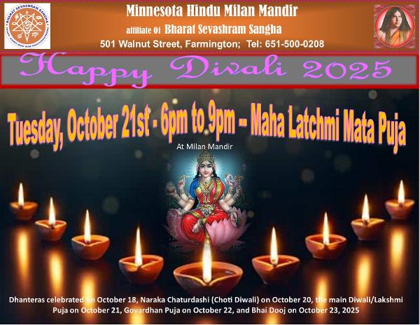 You are all invited to join the Milan Mandir Pariwar in Latchmi Mata and Ganesh Bhagwan Puja on Tuesday, October 21st, 6pm to 8pm.