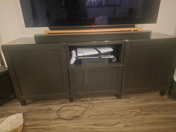 Modern TV stand / media console with a clean dark wood finish. Perfect for living room setup with plenty of storage.
