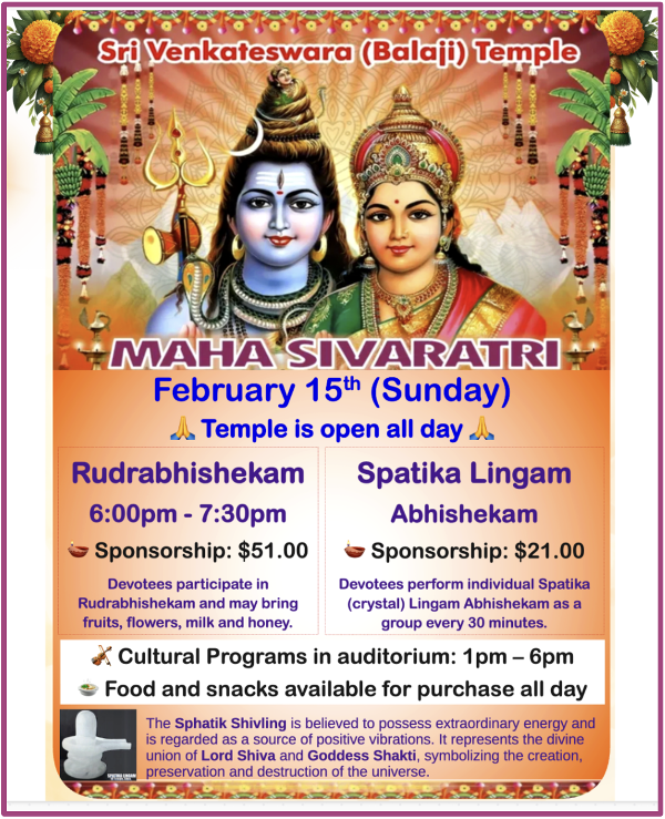 Temple is open all day Rudrabhishekam 6:00pm-7:30pm Spatika Lingam Abhishekam Performed as group every 30 minutes Food and snacks available for purchase all day Cultural programs https://tinyurl.com/svtsivaratri26 For further deta