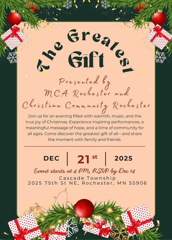 Join us for an evening filled with warmth, music, and the true joy of Christmas. Experience inspiring performances, a meaningful message of hope, and a time of community for all ages. Come discover the greatest gift of all—and share the moment with