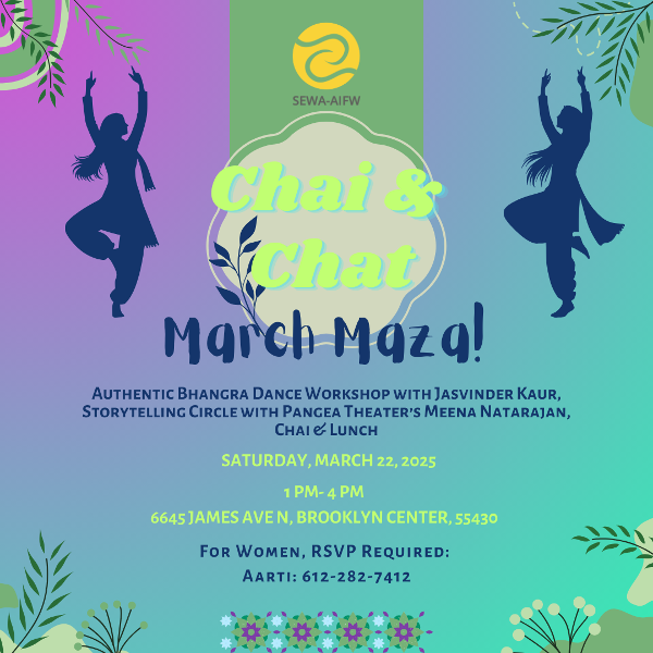 Welcome to "March Maza," our March "Fun" Chai & Chat event on March 22nd from 1-4 PM! Get excited for something new this time: a two-part event. First, Jasvinder Kaur will be leading us in an authentic Bhangra dancing workshop with traditional music and all! Next, we will have a storytelling circle with local Pangea Theater's Artistic & Executive Director, Meena Natarajan. Feel free to bring a friend or two, and let's all move together! All dancing skill sets are welcome so come for some fun, women and femmes only. Please RSVP with the number on the flyer if you are coming and we cannot wait to see you!