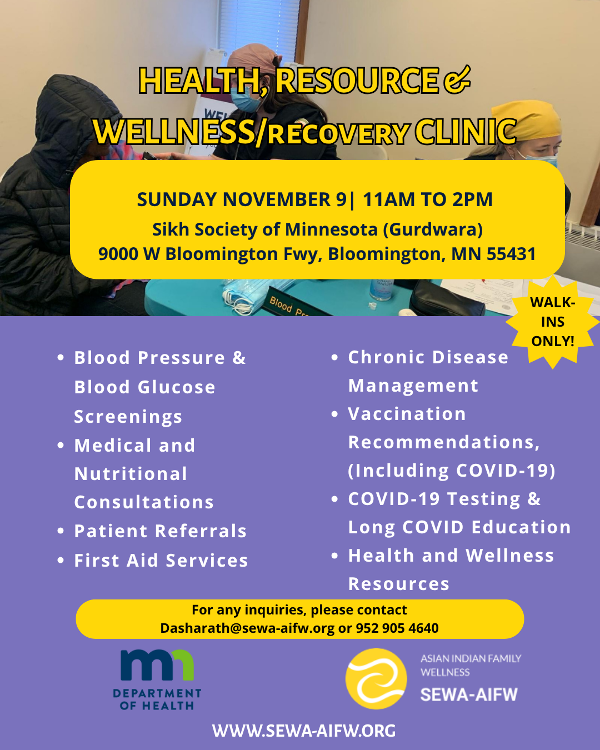 Join us for a free health and resource clinic on Sunday, November 9th, from 11 a.m. to 2 p.m. at the Sikh Society of Minnesota (Gurdwara), 9000 W Bloomington Fwy, Bloomington, MN 55431.