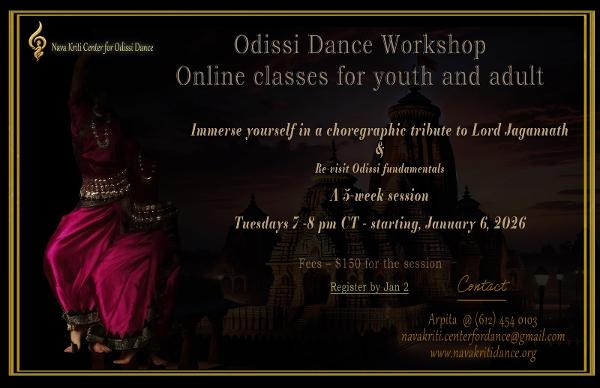 A 5 week course-Brush up your Odissi fundamentals and learn a pure Odissi choreographic piece. Session starting on Jan 6' 2026.