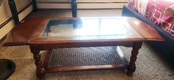 Rectangular wooden with glass top and extended leaflet at both end. Good condition for an immediate move out sale.