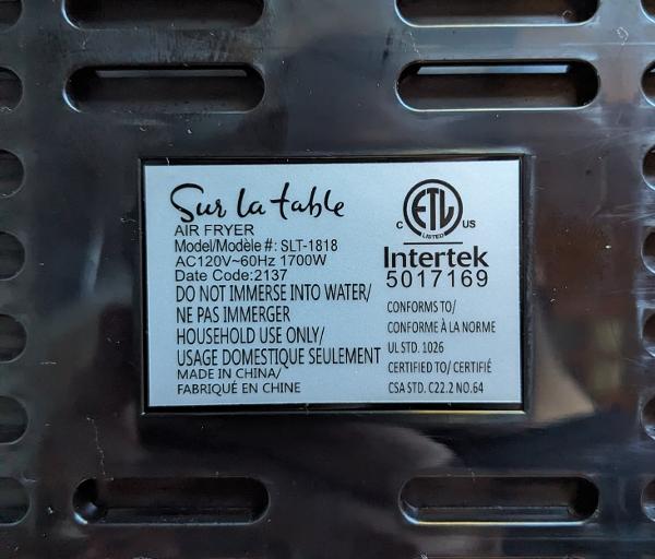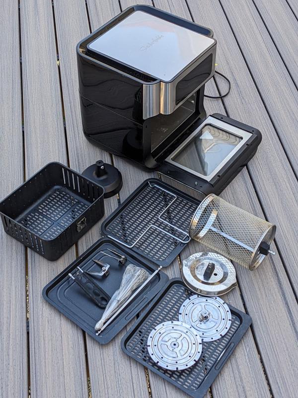 Sur La Table multifunctional air fryer - can be used in many ways. Includes accessory set - Rotisserie pieces, kabob sticks, basket, drip pan, tray, with original recipe book.