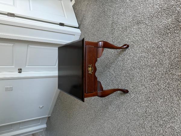 Beautiful solid wood side tables. Has a rich, dark finish. Each table has a drawer with a decorative brass pull. This set includes one square, one rectangular, and one round table. All have classic cabriole legs. Selling each for $50